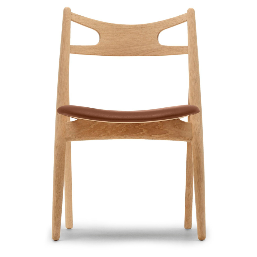 Hans J. Wegner designed the CH29P Sawbuck Chair in 1952. His inspiration was drawn from the sawbucks and saw horses used by carpenters and woodcutters – he added upholstered comfort to ensure a unique touch. The CH29P Sawbuck Chair, designed by Hans J. Wegner, has clean, simple lines and a unique construction. The seat is significantly wider at the front, and – along with the very curved back –ingeniously enhances comfort in various sitting positions while providing a stylish expression. This elegant chair was taken out of production in the 1970s and relaunched 20 years later at the suggestion of Wegner’s family, becoming an immediate success thanks to its organic, comfort-driven design and unique aesthetic. The CH29P Sawbuck Chair is available in different colors and wood types with a comfortable seat upholstered in fabric or leather and complements a variety of interiors and styles. The Sawbuck Chair is also available in the CH29T model with an oak frame and walnut seat and back.